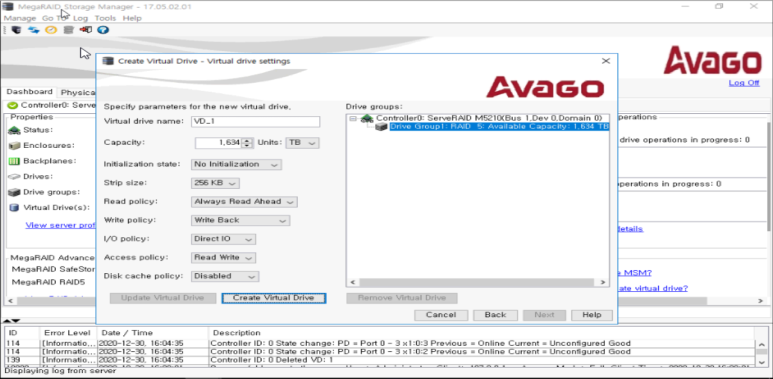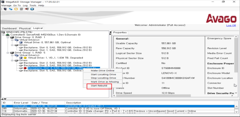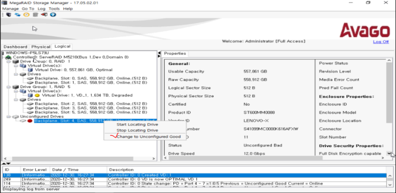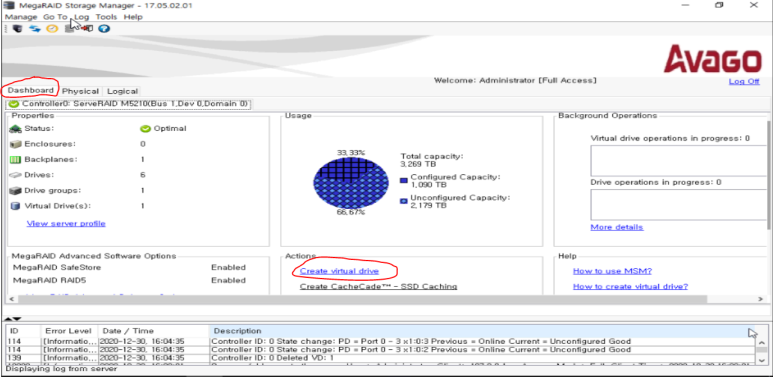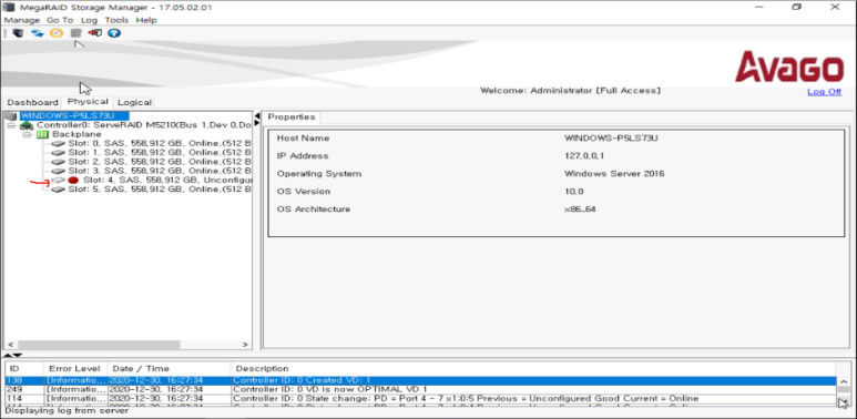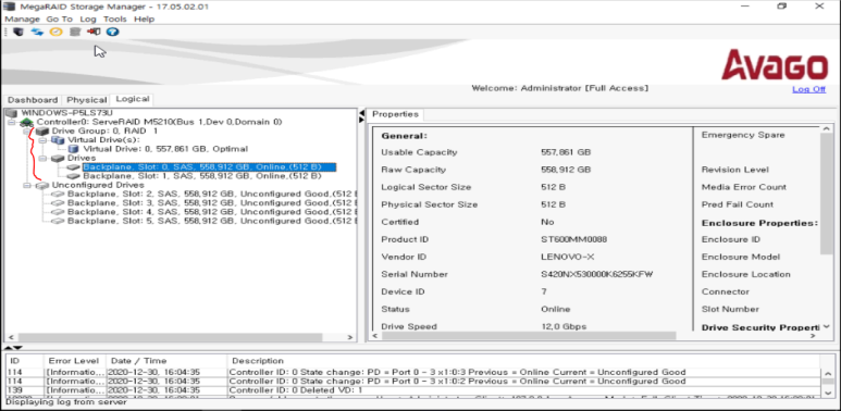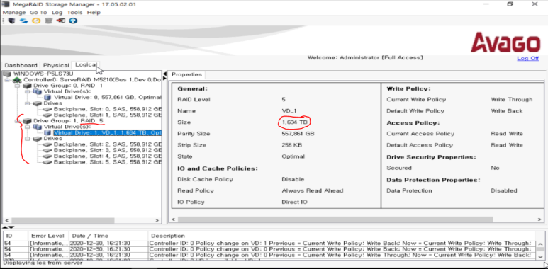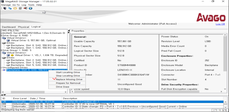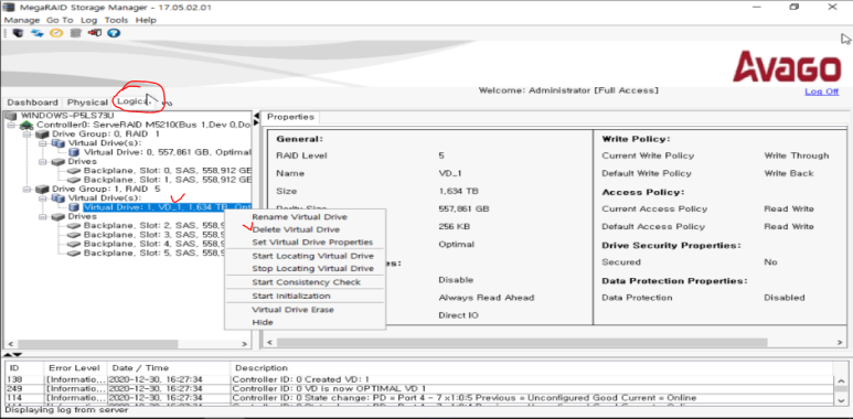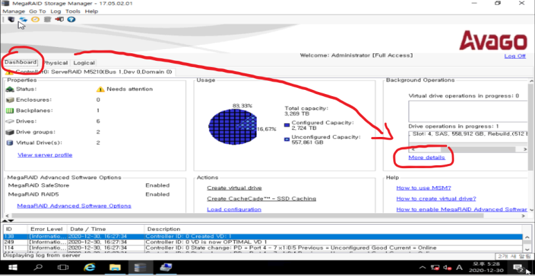 MegaRAID 실행 후 Logical 탭에서 확인하면 보통 다음과 같은 상태다.