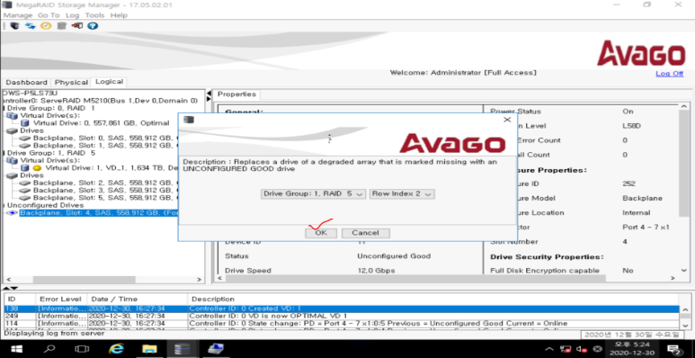 레이드 생성 후 Logical Tab 에서 레이드5가 보이는지 확인한다